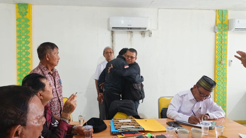 Keduanya tampak bersalaman dan berpelukan, dengan raut wajah yang mencerminkan suasana kekeluargaan.